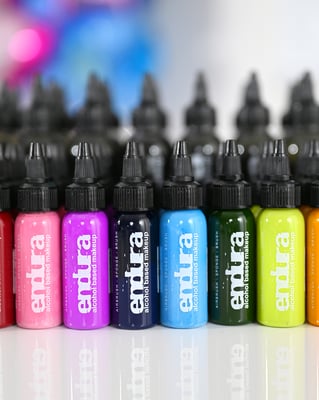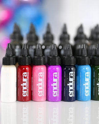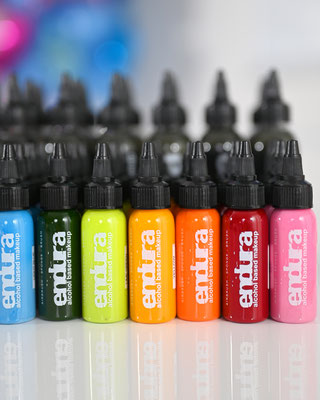 Endura is an alcohol based fast drying makeup that provides rich coverage, unlimited blending and layering, no cracking, clog-less performance and extreme durability (sweat and waterproof). Made with FDA approved colors, Endura is perfectly safe for direct skin contact and prosthetic applications. Endura dries upon contact, making it ideal for a fast paced special effects environment such as haunted houses, movie sets, body art operations and theatre makeup departments.